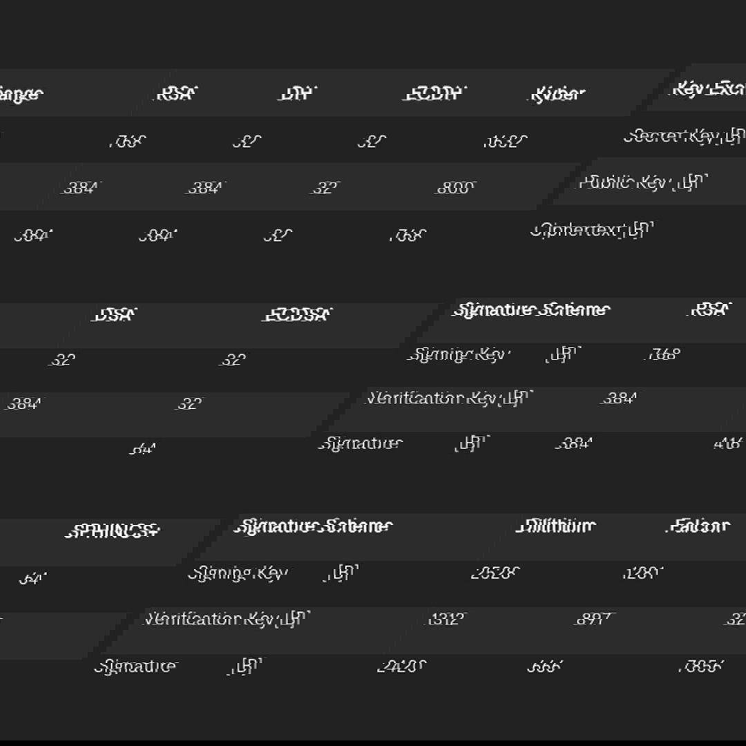 Furthermore, while the new post-quantum algorithms are reasonably fast, they lead to much larger keys, ciphertexts, and signatures than the algorithms that we use today. This might impact the transition phase, as some protocols have hard-coded packet sizes (such as TLS) or devices have memory constraints (IoT). We have the following sizes, in Bytes, for classical and post-quantum schemes: